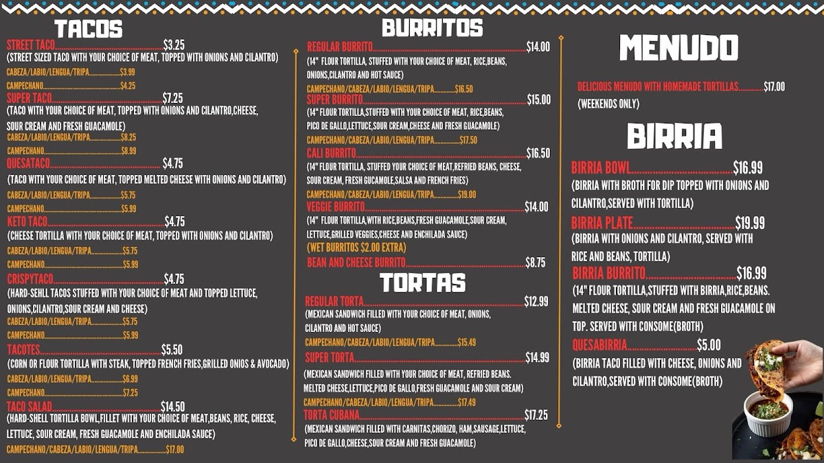 Tacos Revolucion offers a diverse and vibrant menu that caters to a wide variety of tastes, from traditional Mexican street food to indulgent plates bursting with flavor. Starting with appetizers, customers can enjoy options like the Fries or the hearty Gringas. For those in the mood for quesadillas, the Cheese Quesadilla and Super Quesadilla are popular choices, with prices generally affordable. Moving onto larger combinations, the Two Taco Plate for $8 and Carne Asada Plate for $11 are standouts, alongside the flavorful Chile Verde Plate. The restaurant's Cielo, Mar Y Tierra Fajitas offers a delicious mix of grilled meats and seafood, perfect for sharing. Birria enthusiasts will love the Birria Plate or the innovative Quesabirria and Birria Burrito, each offering a unique twist on this traditional dish. For those craving tortas, the Regular Torta or the indulgent Super Torta and Torta Cubana are excellent choices.