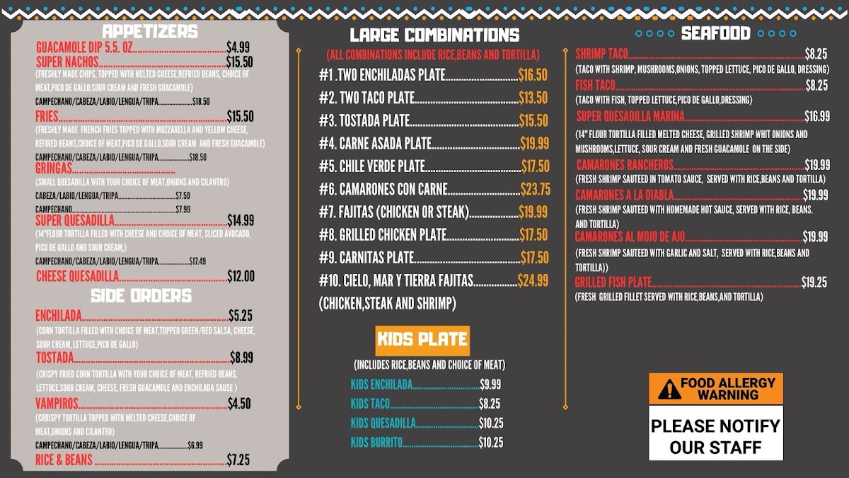 Seafood lovers are well catered for with the Camarones Al Mojo De Ajo or the Super Quesadilla Marina. The Grilled Fish Plate and Camarones Rancheros also highlight the fresh flavors of the sea. Taco Tuesday specials bring a great value for taco fans, while the kids' menu provides options like the Kids Burrito or Kids Taco, ensuring the whole family can find something to enjoy.